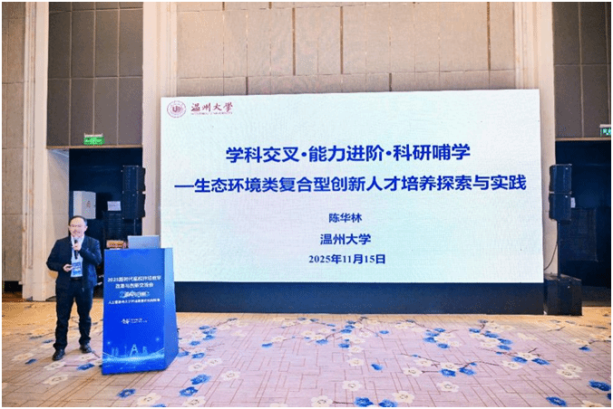 会上,温大生环学院教学团队教授陈华林作了题为《学科交叉·能力进阶·科研哺学——生态环境类复合型创新人才培养探索与实践》的专题报告,系统介绍了学校在复合型创新人才培养方面的教学改革举措与成效,引发与会代表的广泛关注与热烈交流。