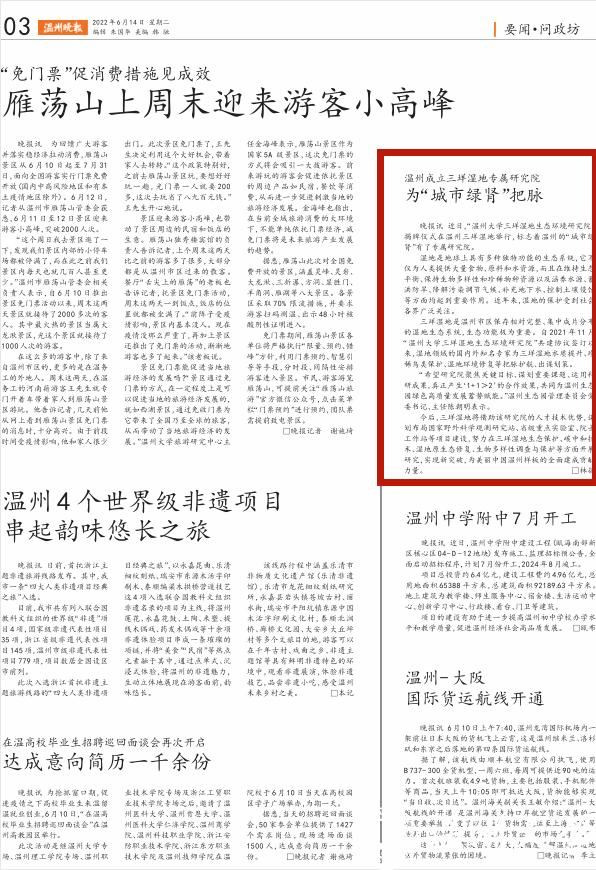近日,“永利集团三垟湿地生态环境研究院”揭牌仪式在温州三垟湿地举行,标志着温州的“城市绿肾”有了专属研究院。湿地是地球上具有多种独特功能的生态系统,它不仅为人类提供大量食物、原料和水资源,而且在维持生态平衡、保持生物多样性和珍稀物种资源以及涵养水源、蓄洪防旱、降解污染调节气候、补充地下水、控制土壤侵蚀等方面均起到重要作用。近年来,湿地的保护受到社会各界广泛关注。三垟湿地是温州市区保存相对完整、集中成片分布的湿地生态系统,...