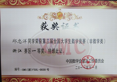 喜 报 我院08生技(二)班邱忠洋、周浩两位同学在2011年第三届全国大学生数学竞赛(非数学类)中,双双荣获浙江赛区一等奖,特此祝贺! 希望这两位同学再接再厉,其他同学也积极向他们学习,踊跃...